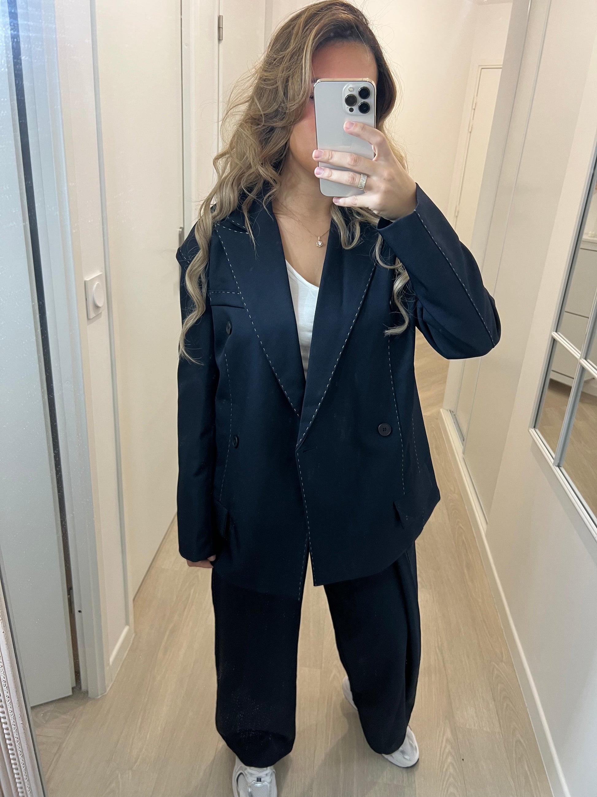 Ce blazer à double boutonnage redéfinit le power dressing. Sa coupe oversize et sa couleur noir profond sont sublimées par des surpiqûres blanches contrastantes qui accentuent les lignes de coupe et la structure.