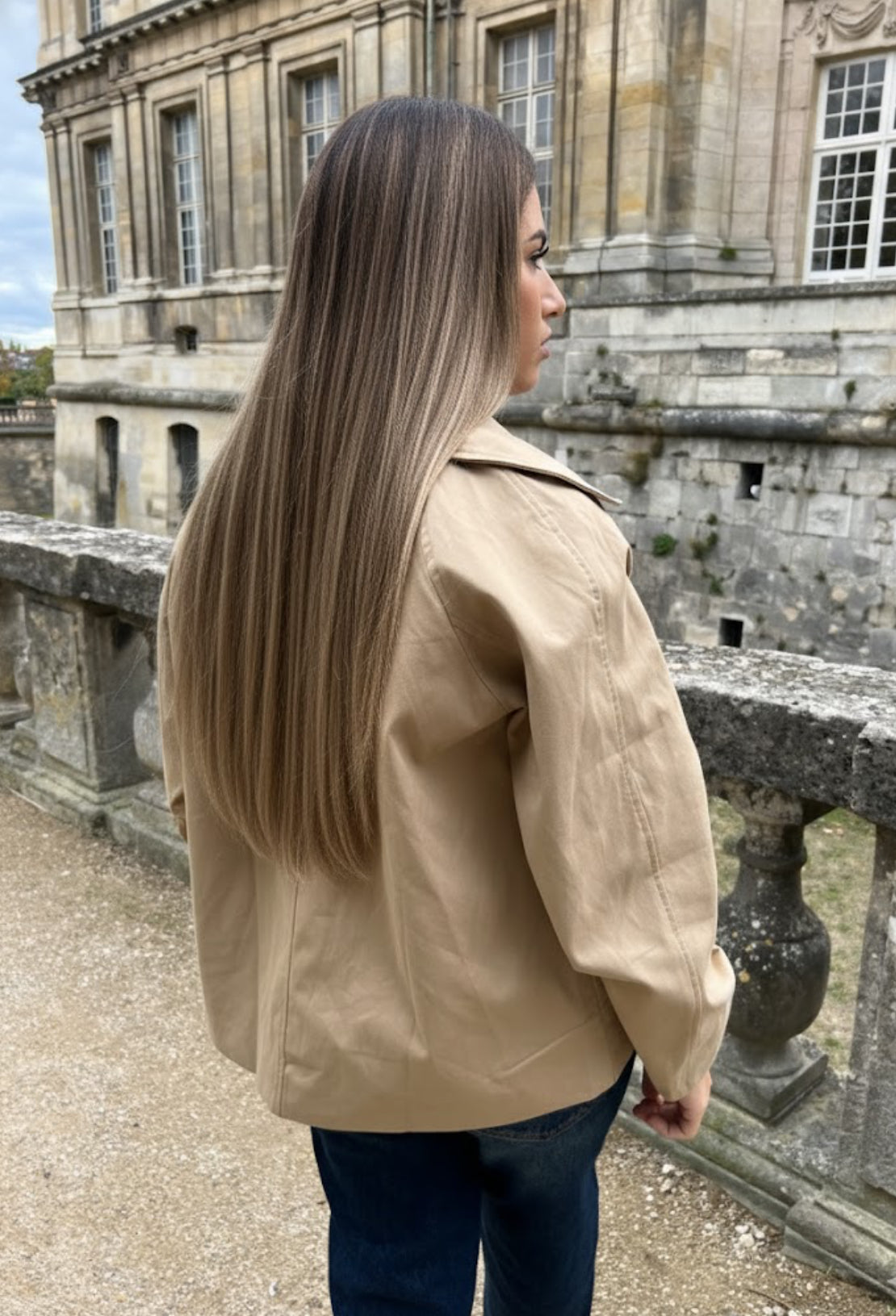 • Coupe : Courte et légèrement oversize, inspirée de la tendance cropped pour une silhouette moderne et décontractée.