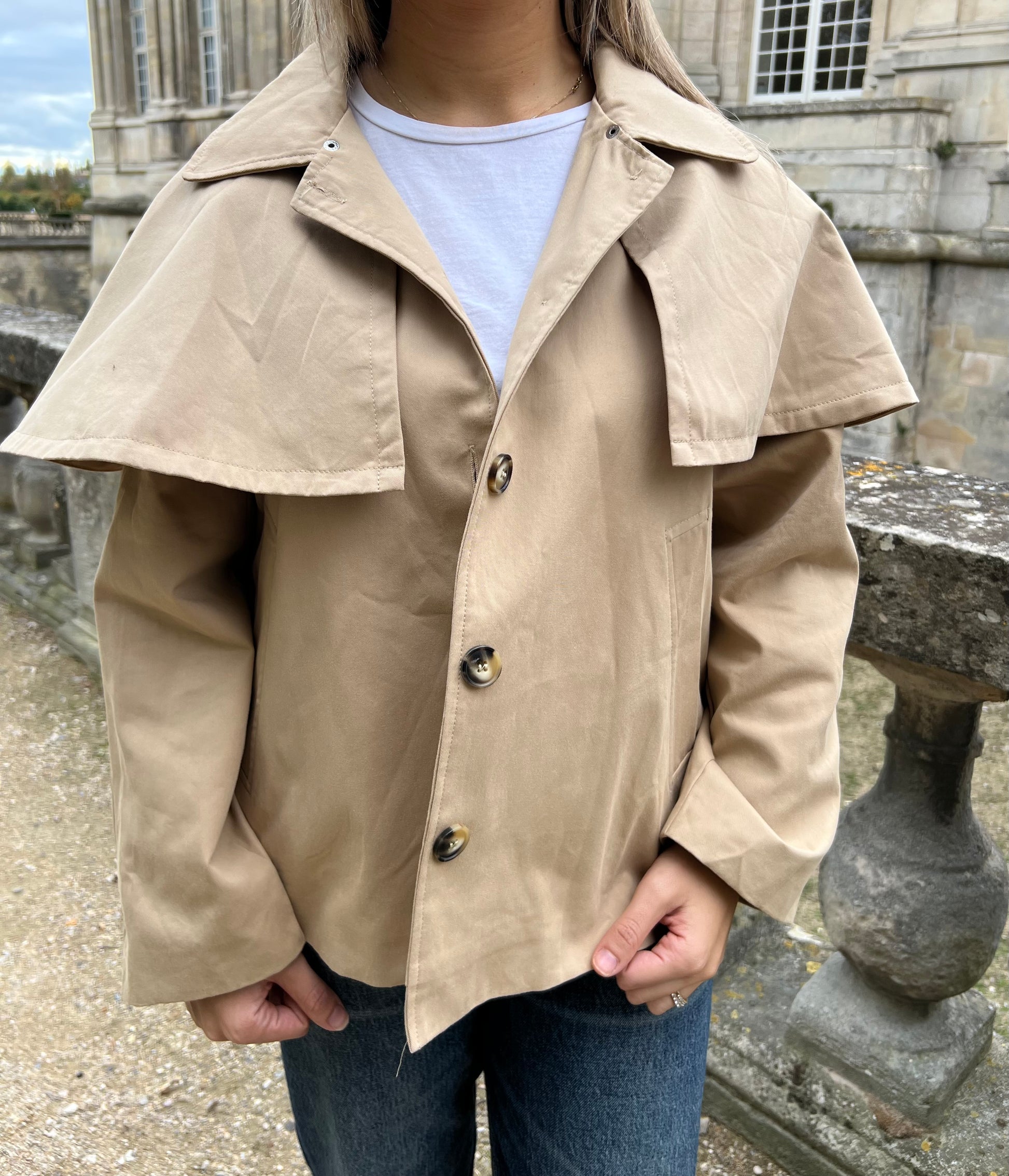 Adoptez la pièce phare de la saison ! Ce trench court de couleur beige intemporelle se distingue par sa coupe tendance, inspirée des looks minimalistes et chic que l'on voit partout. Sa caractéristique unique : une cape amovible qui le transforme et vous permet d'adapter votre style en un clin d'œil.